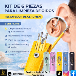 Kit profesional de limpieza de oídos diseñado para retirar el exceso de cerumen de forma segura, precisa e higiénica. Fabricado con herramientas de acero inoxidable reutilizables, permite una limpieza más controlada que los hisopos tradicionales, ayudando a mantener una buena higiene auditiva.